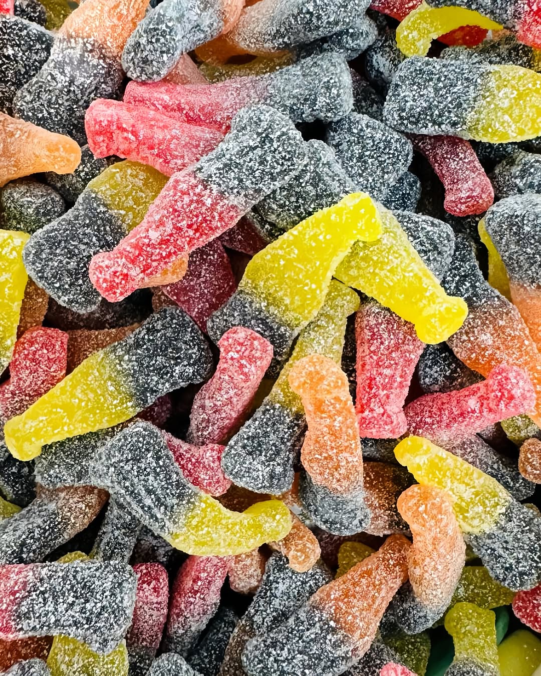 Bonbons gélifiés halal en forme de bouteilles, fruités et acidulés, avec une texture moelleuse et un goût sucré-piquant très gourmand.