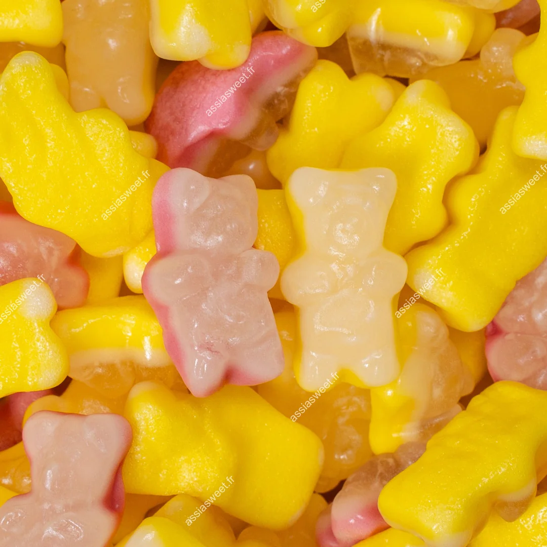 Bonbons gélifiés en forme d’oursons fourrés, fruités et moelleux avec un cœur fondant à l’intérieur.