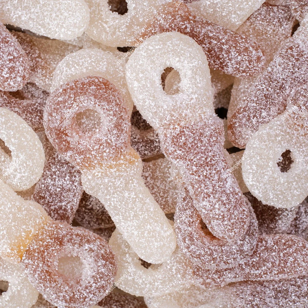 Bonbons gélifiés en forme de tétine, au goût cola sucré avec un enrobage citronné acidulé et une texture tendre et moelleuse.
